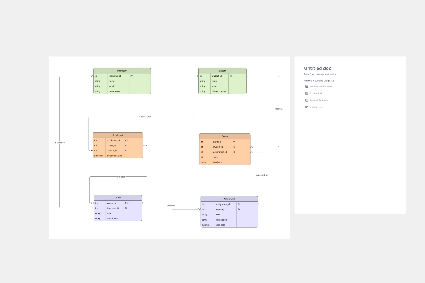 ERD 教育学習管理システム テンプレートは、教育システムの管理と編成を効率化するように設計されており、特にオンラインとハイブリッド学習環境に適応している機関に役立ちます。学生、コース、講師、課題、成績といった主要なエンティティとそれらの関係を特定することで、学習管理システム(LMS)の機能を効果的に計画し、実施するのに役立ちます。